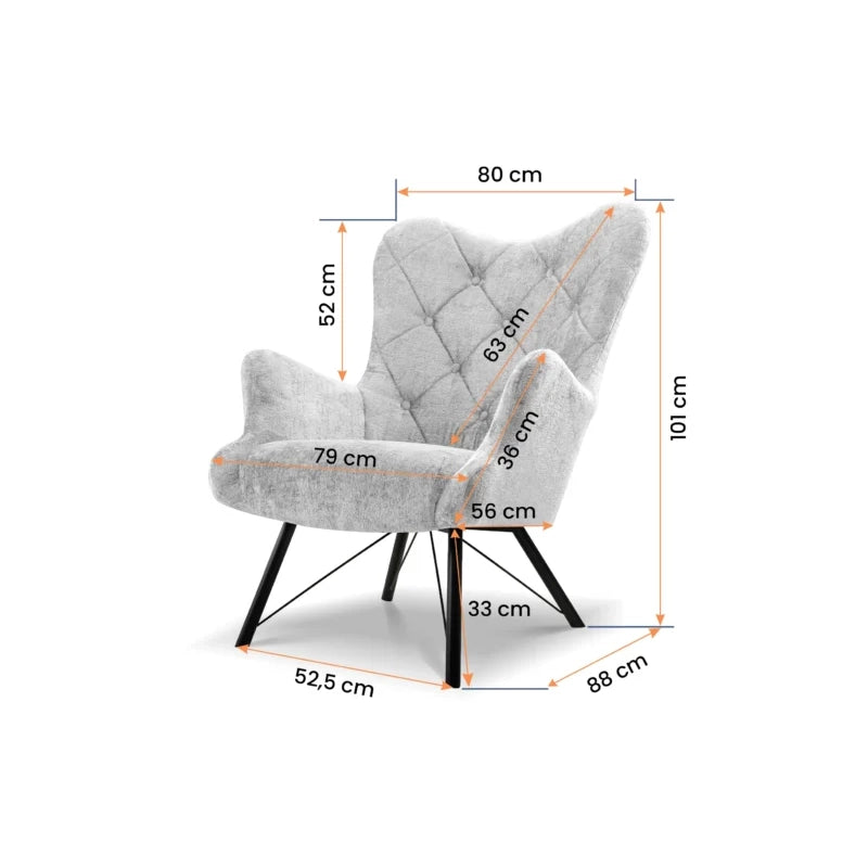 Nugarinė dalis taip pat aptraukta audiniu, atitinkančiu viso baldo spalvą – todėl fotelis gali stovėti net kambario centre