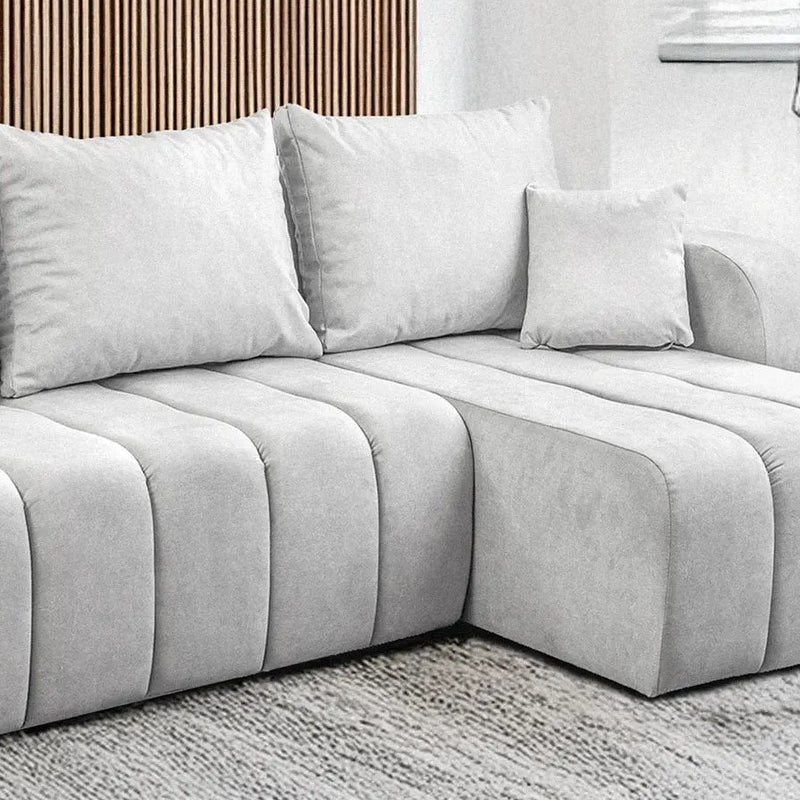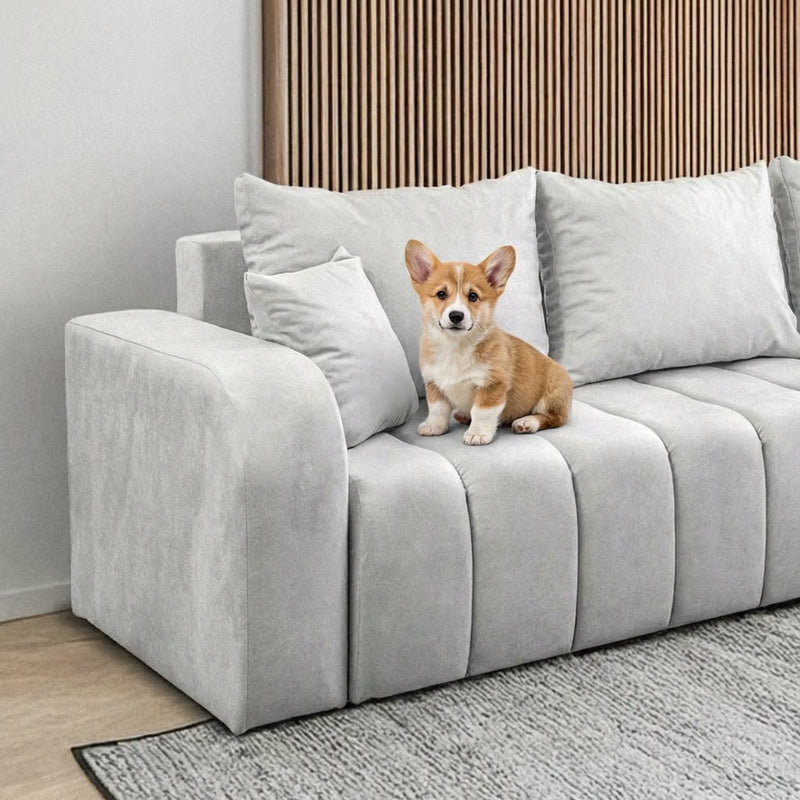 Tiesios linijos, subtilūs vertikalūs siuviniai ir solidus veliūras kuria įspūdį, kad čia ne šiaip baldas, o pagrindinis kambario veikėjas.
