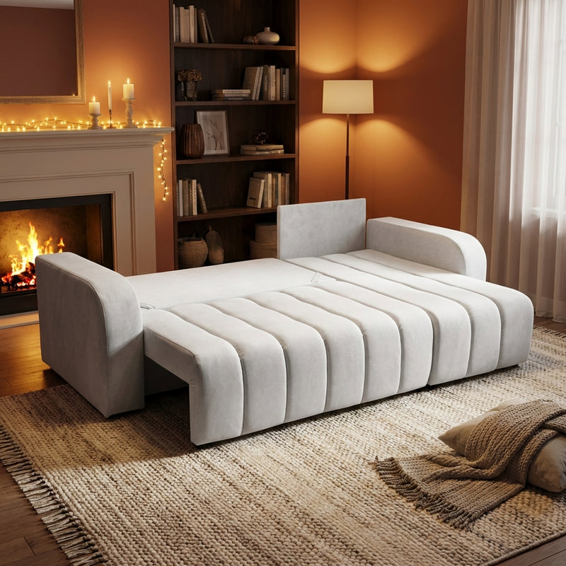 Pakanka vieno švelnaus judesio – sėdimoji dalis išslysta, pakyla ir susijungia į lygią miego erdvę.